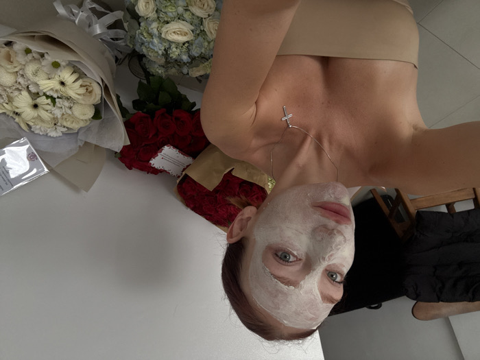 A person with a face mask wears a beige tube top and a silver cross necklace. The image is rotated. Three bouquets of flowers surround her: white gerbera daisies, blue hydrangeas and roses, and red roses. A card sits near the white gerberas. Behind her, a chair is partially visible with a black fabric draped over it.
