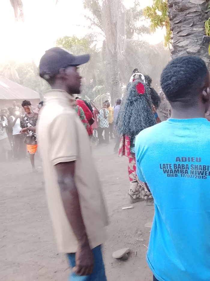 The scene depicts an outdoor gathering in an unpaved area in Tabu, Nigeria. Approximately 15-20 individuals are visible. In the foreground, an adult male stands in profile on the left, wearing a beige polo shirt, blue jeans, and a dark baseball cap, facing right. To his right, an adult male is seen from the back, wearing a bright blue t-shirt with white text reading "ADIEU LATE BABA SHABIU WAMBA NIJWE DIED: 17/07/2015". In the midground, a central masquerade figure stands, adorned with a dark, shaggy costume, red circular accents on the chest, a stylized headpiece with white and dark elements, and patterned red, white, and black fabric covering the lower body. Shell or rattle adornments are visible on the figure's ankles. A crowd of spectators gathers in the background, observing the masquerade figure. One woman in the left background is smiling, wearing a dark patterned top and orange shorts, and holding a mobile phone. Other individuals in the background also appear to be holding mobile devices. The ground is dry, unpaved dirt, with a light-colored object resembling a slipper present between the two foreground men. In the distant background, structures with corrugated metal roofs are visible, along with tall palm trees and other tropical foliage. Fine dust particles are suspended in the air. The lighting suggests daytime, possibly late afternoon.