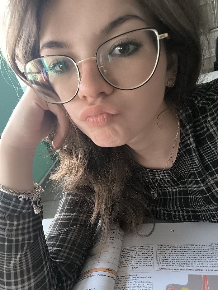 An indoor, eye-level photograph captures a single individual, a young female, looking directly into the camera. She wears glasses with thin, gold-colored frames accented with black, a dark plaid long-sleeved top, a silver-colored charm bracelet on her left wrist, and a delicate necklace with a small pendant. A stud earring is visible in her right ear. Her dark, wavy hair is casually styled. Her eyes are accentuated with eyeliner and mascara, and her lips are pursed in a "duck face" expression. Her left hand is positioned with fingers curled, resting against her lower jaw. An open book or binder, displaying Cyrillic text and a diagram, rests on a light-colored surface in the lower right foreground. The background features a teal-colored wall on the left and a lighter, possibly white, surface on the right. While the prompt specifies the location as Pernik, Bulgaria, no distinctive visual identifiers within the image confirm this specific city.