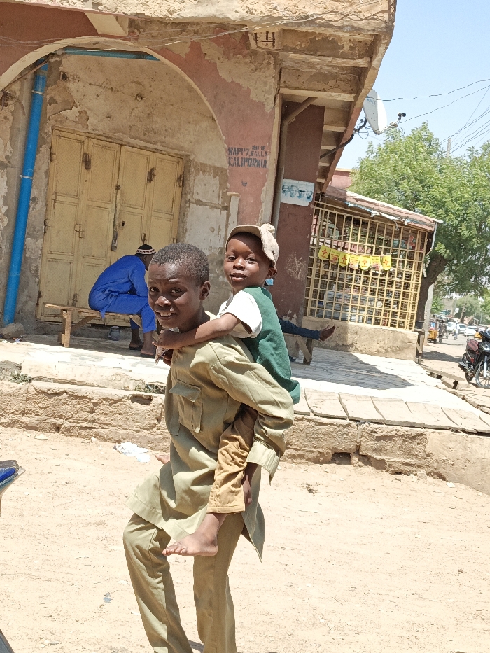 - "A daylight street scene in Gwagwarwa, Nigeria, depicts an older child carrying a younger child piggyback-style on a dirt path in front of buildings" by FM-cSMTg1, licensed under CC BY 4.0