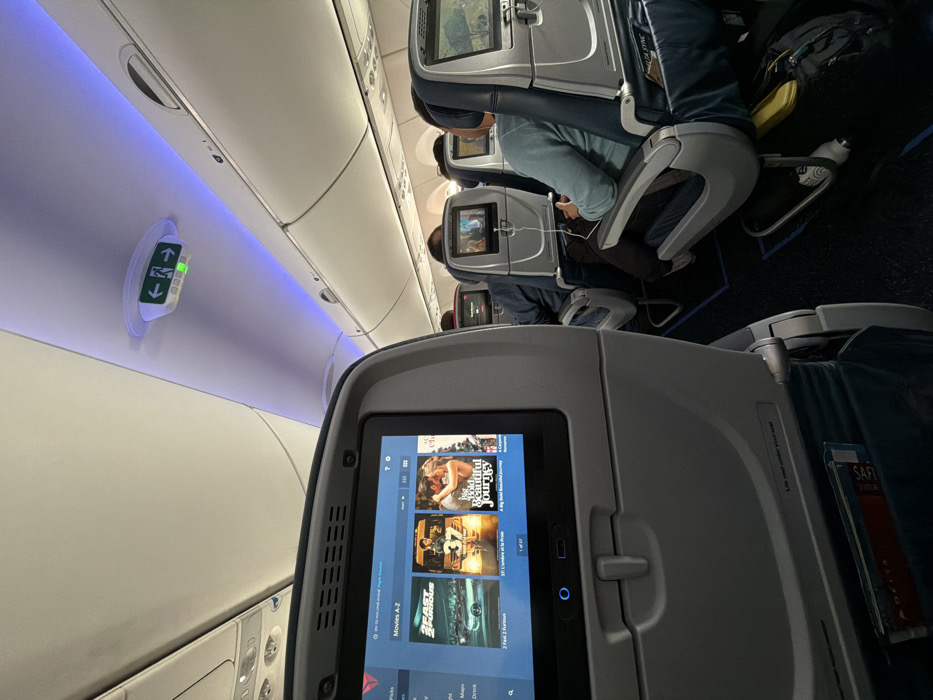 - "Inside an airplane cabin, rows of seats feature entertainment screens displaying movie options" by FM-Uus293, licensed under CC BY 4.0