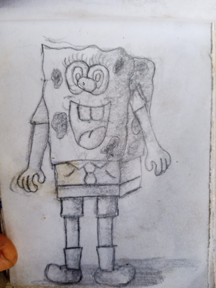 A monochrome pencil sketch depicting the cartoon character Spongebob Squarepants is centered on a light-colored, textured piece of paper
