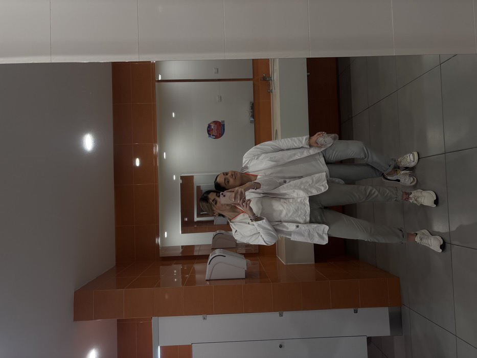 This image captures two adult females reflected in a large mirror within a public restroom or changing facility located in Chablekal, Mexico. The environment features walls predominantly tiled with orange rectangular sections and white rectangular sections, a dark gray tiled floor, and a white ceiling equipped with multiple recessed circular lights. On the left, two white wall-mounted paper towel dispensers and a white privacy stall door are visible. The large mirror spans the wall above a light-colored counter fitted with multiple sinks and faucets. A circular sticker or sign with a red border and the partially visible text "CONTIGO" is affixed to the mirror. The female on the left, taller with light brown hair pulled back, is actively taking a mirror selfie, holding a light pink smartphone with both hands in front of her face. She is dressed in a white medical-style jacket over a white top, light gray trousers, and white athletic shoes. Multiple bracelets are visible on her left wrist. The female on the right, shorter with dark hair, stands slightly behind and to the right of the first, looking towards the camera. She is similarly attired in a white medical-style jacket over a white top, light gray trousers, and white athletic shoes, and holds a clear plastic water bottle in her right hand. Both individuals appear to be wearing medical or institutional uniforms.