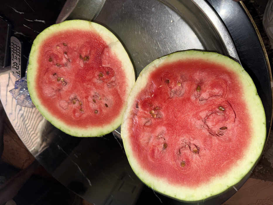 - "The image displays two horizontally bisected watermelon halves, revealing vibrant red flesh and numerous dark brown to black seeds" by FM-drzm52, licensed under CC BY 4.0