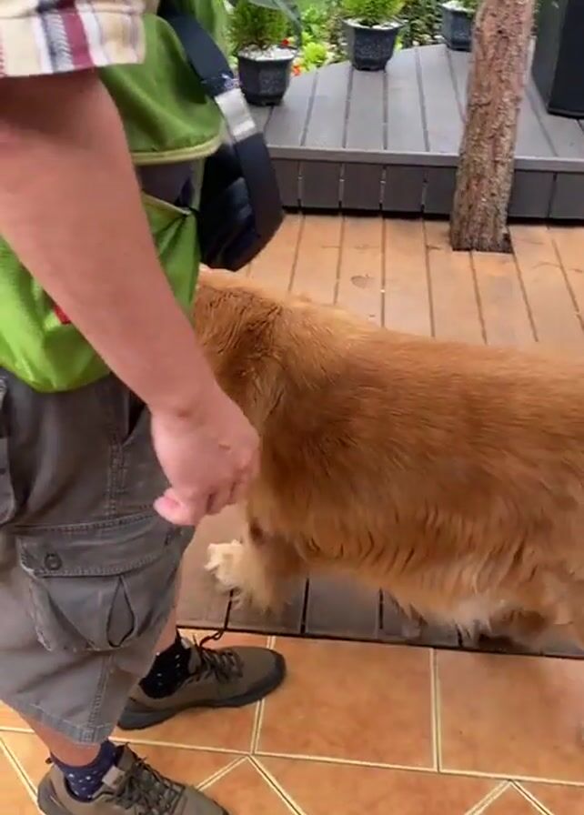golden retriever dog walking on a patio and wooden deck area. The dog is facing away from the camera, exploring the outdoor space. People are present but are not directly interacting with the dog in the video. The environment includes plants, a white railing, and various outdoor decor elements. The scene appears to be set in a residential or recreational outdoor area.