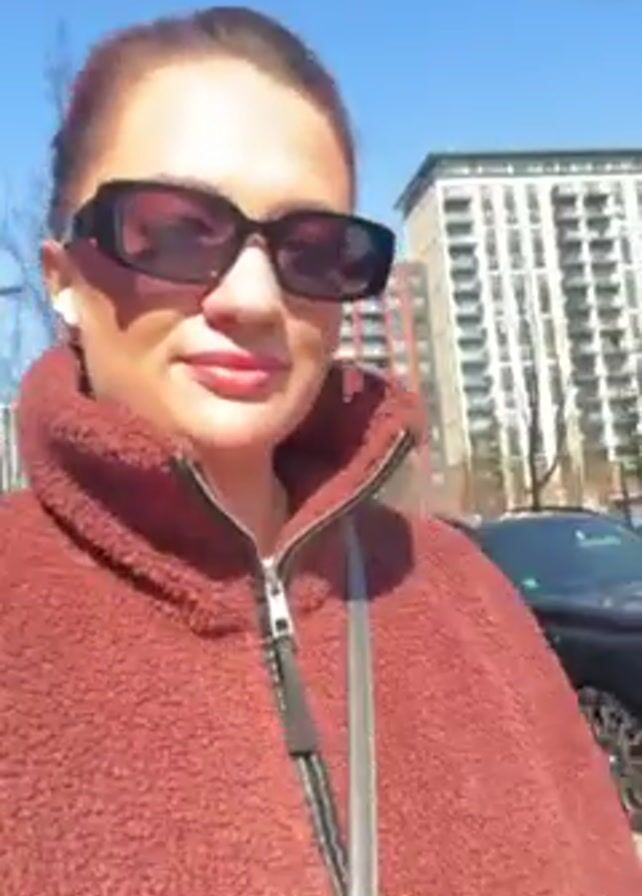 A woman walks outside on a sunny day. She is wearing a maroon, fleece-like zip-up jacket, sunglasses, and has wireless earbuds in her ears. She also has a strap for a bag slung across her shoulder. She is walking on a city street with tall buildings, cars, and trees in the background. The sky is blue and cloudless. She looks directly at the camera and smiles briefly. She continues walking and looking around.