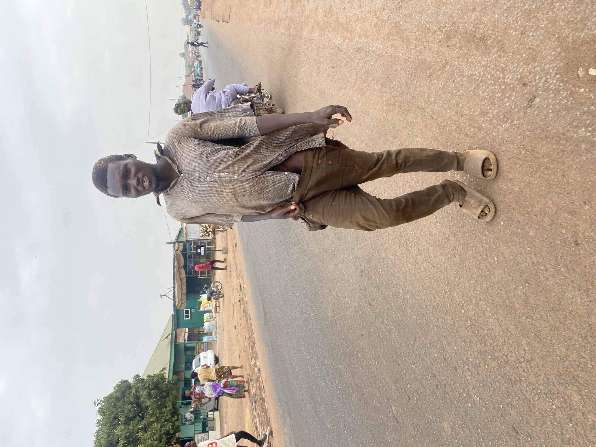 The photo shows a man standing on a paved road in Rido, Nigeria