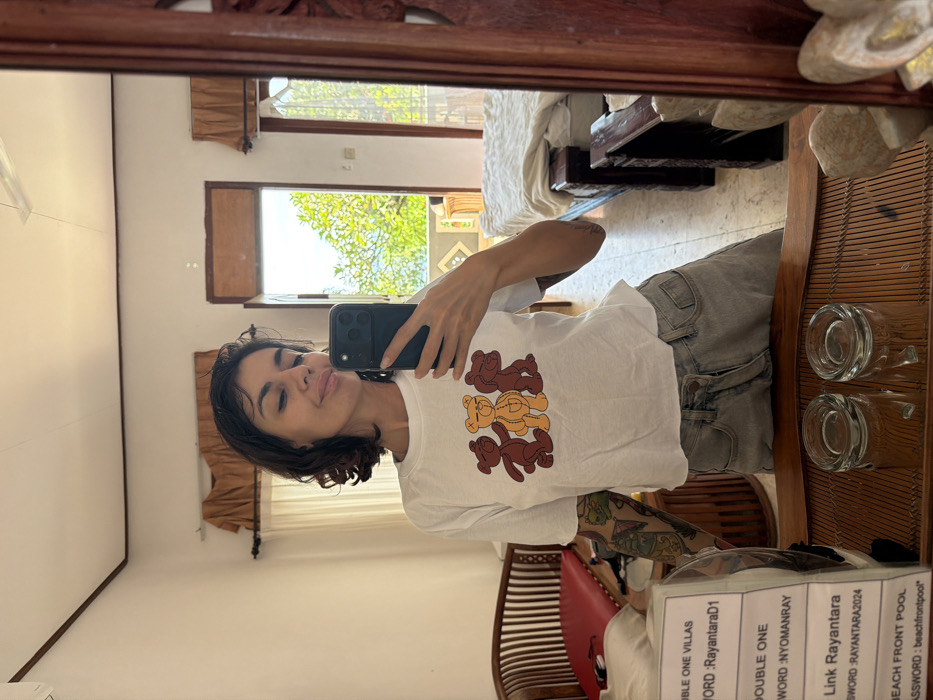 mirror selfie of a woman wearing a white t-shirt with three cartoon bears