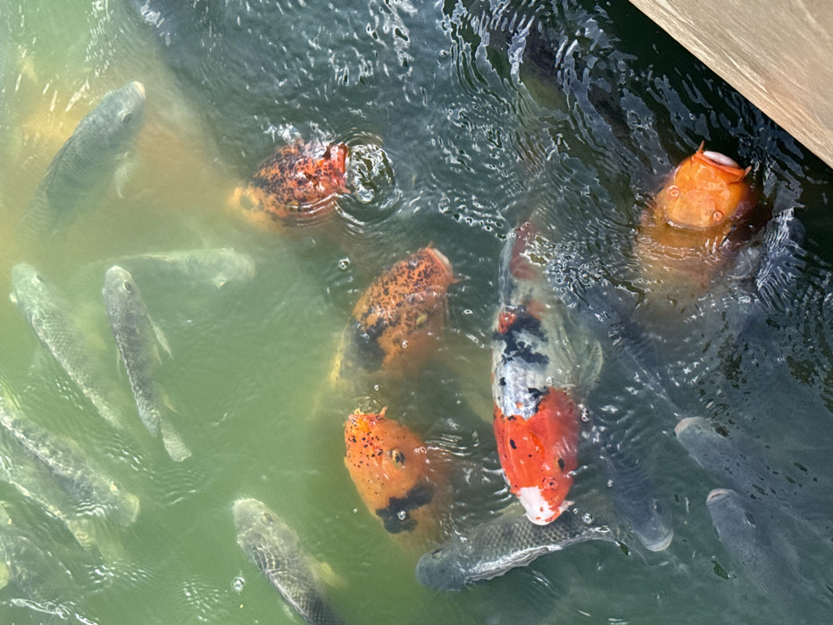 The image displays an overhead view of a densely populated body of water, located in Santa Clara Ocoyucan, Mexico. The scene features numerous fish of diverse species and coloration. Approximately two dozen fish are visible. Many are dark gray or greenish-gray, elongated fish, consistent with Tilapia, scattered throughout the frame. Interspersed among these are several Koi fish. A prominent Koi in the lower center exhibits distinct irregular patterns of red, white, and black/dark gray. Other Koi are predominantly orange with black speckles or patches. Multiple orange Koi are positioned near the water's surface with their mouths slightly agape, suggesting active feeding or surfacing. The water is murky, exhibiting variations from a lighter greenish hue to a darker, more opaque tone, with visible surface ripples. A light-colored, linear wooden structure is present along the bottom right edge of the frame. No human subjects are visible.