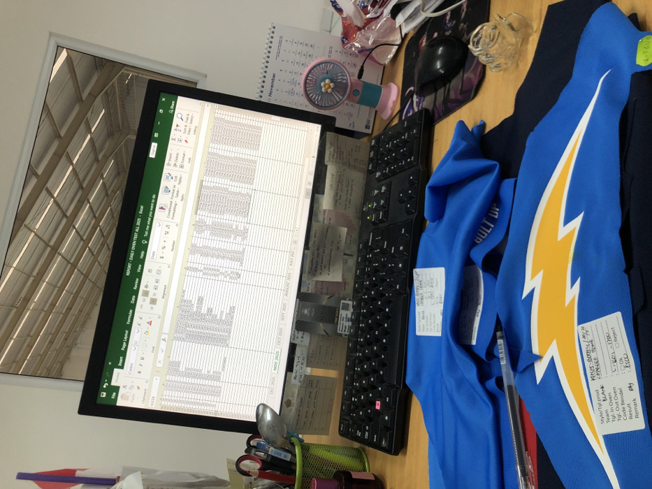 The scene depicts an active workstation on a light-colored wooden desk within a manufacturing facility in Semarang, Indonesia. A large computer monitor dominates the center, displaying an Excel spreadsheet titled "REPORT - DAILY OVEN TEST ALL 2025" for various months, with "NOV 2025" highlighted. Rows of data are visible on the spreadsheet. A black desktop keyboard is positioned directly in front of the monitor. In the foreground, two blue fabric items, identified as clothing or jerseys, are laid flat. The lower item is royal blue, featuring a prominent yellow lightning bolt graphic. A white adhesive label on this item provides product details: "Style/Tgl.prod: MH05-B0099 / 20/20", "Team: CHARGER BLANK", "Tgl. In Oven: C/KO1-1700", "Tgl. Out Oven: C/K01-1700", and "Result: [X] OK [ ] Reject". The "OK" box is marked. A black pen with a silver clip rests between this item and the one above it. The upper fabric item, also blue, is partially folded and displays "BUILT UP" text. It bears a similar white label indicating "Item Name: Tgl. BLANK", "Oven Code: 230", and "Result: [X] OK". To the left of the monitor, a green mesh cup contains various writing instruments and scissors. Behind it, a small red and white flag is partially visible. The base of the monitor stand is covered with numerous yellow rectangular sticky notes bearing handwritten text, some in Indonesian, including "TO DO LIST," and a small gold-colored bar object. To the right of the monitor, a small, pink and blue portable fan with a floral griller design stands next to a white desk calendar displaying "November." Further right, a black computer mouse rests on a patterned mousepad. Scattered crumpled paper or packaging and a clear, ridged glass object are also present on the desk. The monitor's screen reflects an overhead view of a high, industrial-style ceiling with exposed metal trusses and overhead lighting, indicating an interior factory or warehouse environment. No individuals are visible in the scene. The arrangement suggests ongoing quality control or testing procedures for manufactured clothing items.
