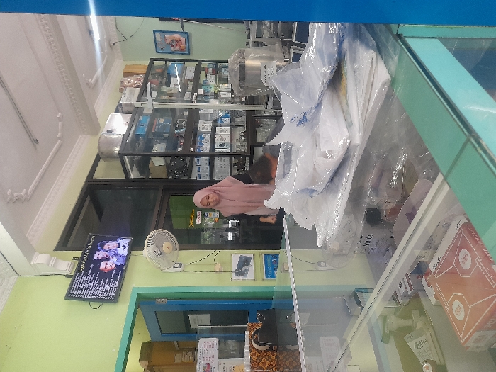 - "Inside a store, a woman in a pink hijab stands behind a glass display case filled with packaged items" by FM-8CAHW2, licensed under CC BY 4.0