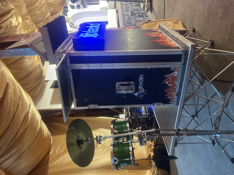 A black equipment case labeled "Black-D" with flame graphics sits atop a silver metal truss stand. A blue LED display rests on the case's top. Drums, including cymbals and green toms, are partially visible beneath. The scene is set against a backdrop of gold draped fabric. The overall impression is of a stage or entertainment setup.