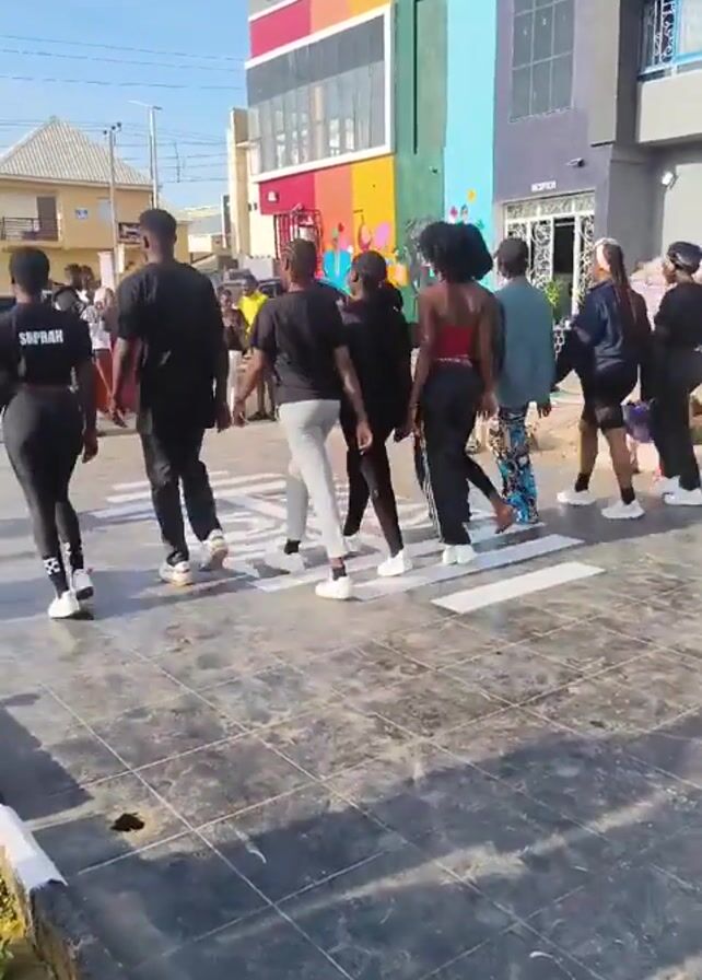 A group of people are walking across a pedestrian crossing. They appear to be a diverse group, mostly young adults. Most of them are wearing dark clothing. The pedestrian crossing is painted with a white design on a gray tiled surface. In the background is a two-story building with a colorful facade and the word "SaNe" on it. The sky is clear and blue. The camera is positioned at ground level and follows the group as they cross the road.