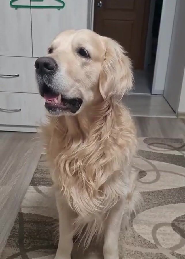 golden retriever dog sitting on a beige rug. The dog is looking to the left, then barks a few times in response to the command "Golos" (which translates to "Voice"), given by a person not visible in the video. In the background, there is a white cabinet with silver drawers, a green hanger hanging on it, and a brown wooden door. The floor is light brown and the rug has a patterned design with shades of brown and beige.