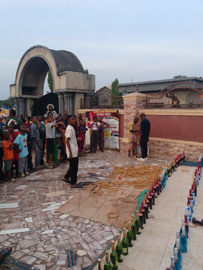 A crowd gathers near a church entrance with a sign for "INTCM AGOR WORLDWIDE SUMMIT 2026". A game area is set up with glass bottles lining a path and golden rings on a sheet. A man in a suit speaks with a woman in a patterned dress next to the sign. Children and adults observe the scene.