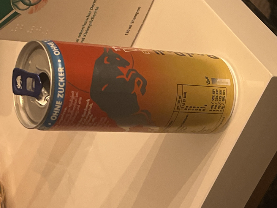 can of sugar-free Red Bull on a white surface. The can is red and yellow with a black bull logo. The tab of the can has been opened. The label includes nutrition information in German, such as "ohne Zucker" (without sugar) and nutritional values per 100ml. A box labeled "120ml Shampoo" can be seen behind the can.