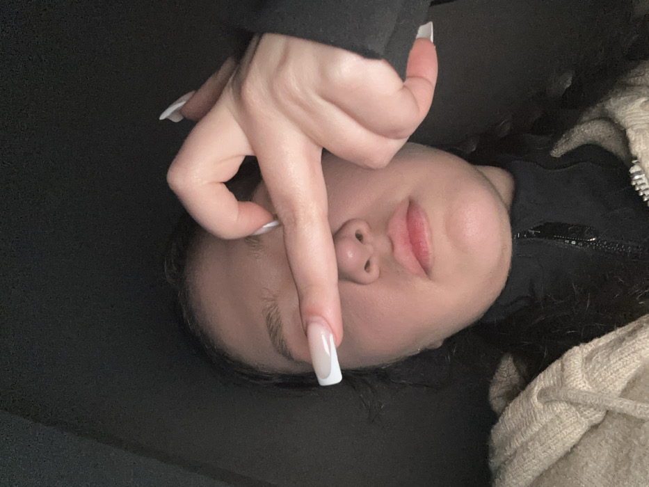 A close-up, vertically oriented photograph captures a female individual from the forehead to the upper chest, set against a dark, featureless background. Her left hand is raised, with the index finger extended horizontally to cover her right eye. The remaining fingers of her left hand are curved inward, creating a 'V' shape formed by the index finger and thumb. She exhibits long, square-tipped acrylic nails with a French manicure featuring a translucent pink base and white tips. Her lips are slightly parted, and her nostrils are visible. She wears a dark, possibly black, zippered garment beneath a lighter, beige-toned knitted outer layer. The lighting is dim. This scene is located in the city of Yerevan, Armenia.