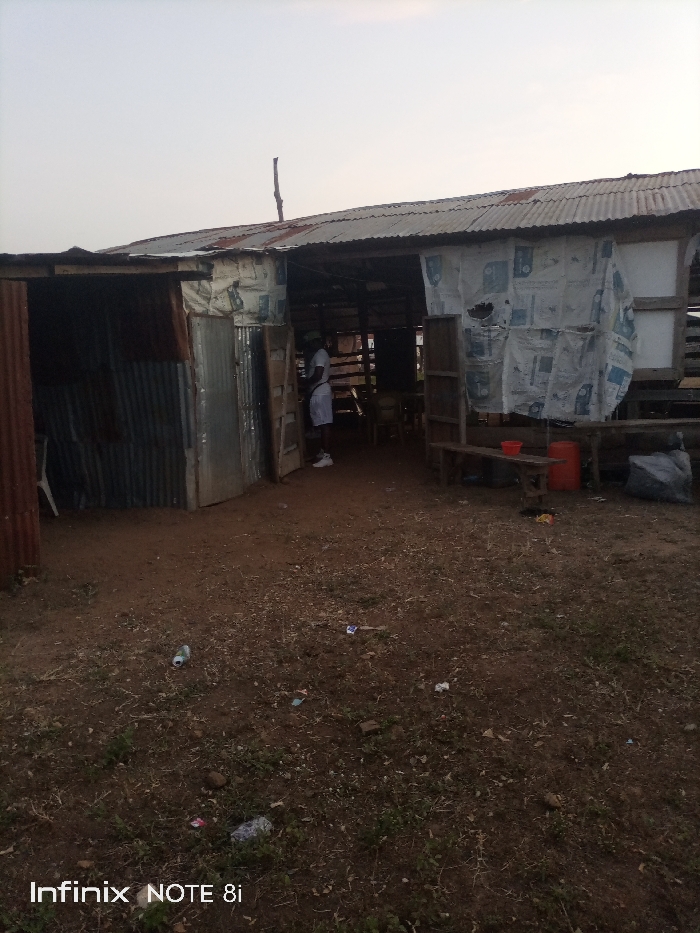 A dilapidated shack with a corrugated metal roof stands on bare, patchy ground littered with trash. The structure appears makeshift, with a combination of wood, metal sheets, and tattered fabric forming its walls. Inside, a person wearing white stands near an opening. A wooden bench and various containers sit outside the building. The overall scene suggests poverty and neglect.