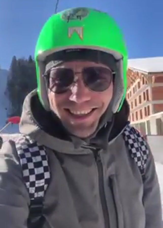 The video features a man, likely in his 30s, wearing a green ski helmet, sunglasses, and a grey jacket with a black and white checkered backpack. He is outdoors in a snowy environment, presumably a ski resort, with a bright sunny sky. He is smiling and points with his right index finger. Other people are visible in the background, enjoying the snow and activities like sledding. The camera appears to be held by the man himself, giving a first-person perspective.