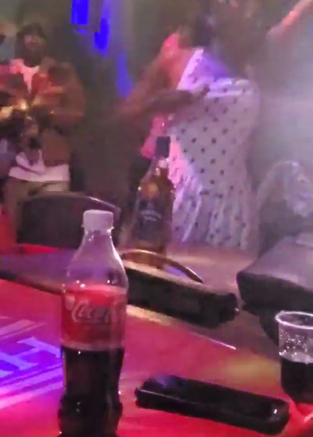 The video takes place in what appears to be a club or bar setting, with flashing lights, music, and people in the background. The foreground features a red-topped bar with a bottle of Coca-Cola, a phone, and a plastic cup filled with a dark beverage. A bottle of alcohol is also visible behind these items. In the background, there are people dancing and socializing. One person, wearing a white dress with polka dots and a red top, is prominent. The overall atmosphere suggests a lively and possibly crowded social gathering.