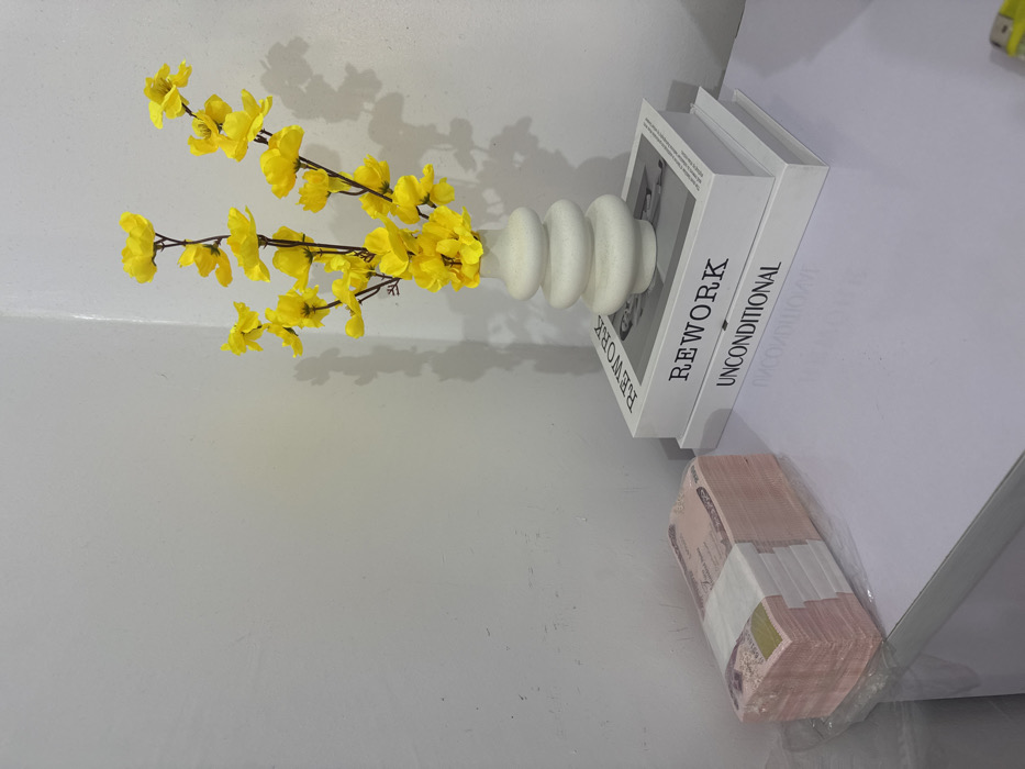 The scene is set indoors, within Aviation Quarters, Nigeria. A substantial stack of Nigerian 500 Naira currency notes, bound with white paper bands and encased in clear plastic, is positioned on the left side of a white, flat surface. To the right, a white, three-tiered ceramic vase holds a bouquet of artificial yellow flowers with green stems. This vase rests on a stack of two decorative books with white covers. The top book displays "REWORK" in black capital letters on its spine and visible cover, while the bottom book shows "UNCONDITIONAL" on its spine. The background consists of a plain white wall forming an interior corner. No individuals are present in the image.