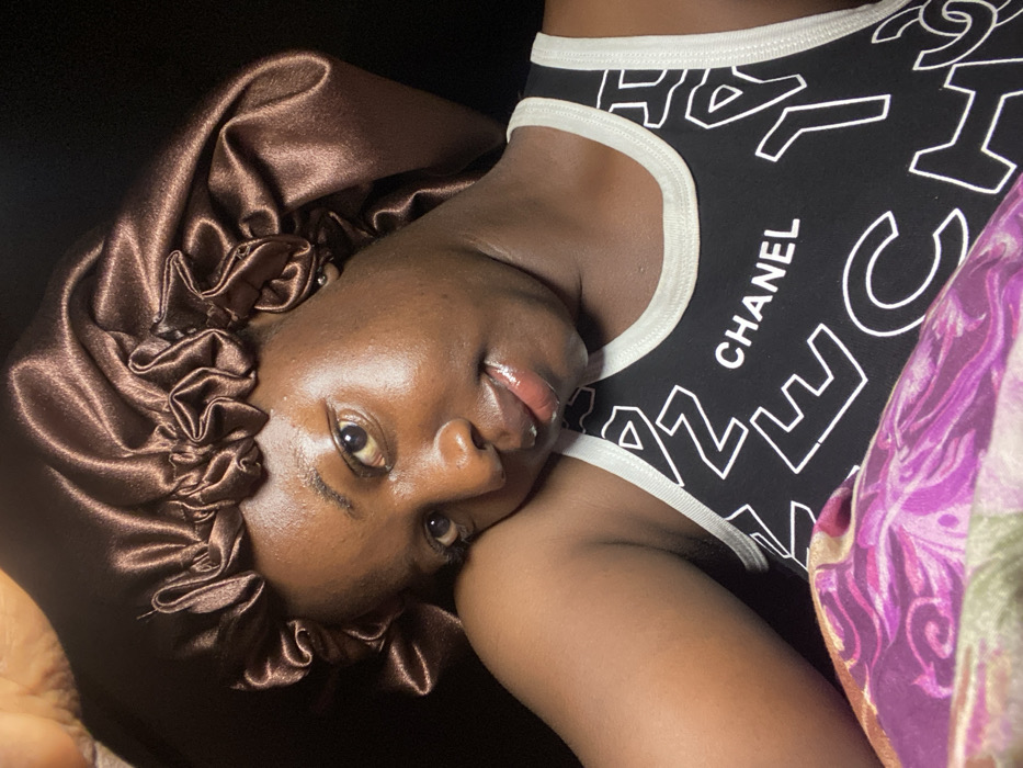 A woman with dark skin and a brown silk bonnet looks at the camera. She's wearing a black tank top with white trim and "CHANEL" printed on it. Her hair is covered by the bonnet, which has a gathered edge. She has full lips with a glossy sheen. The background is dark, and a purple and white floral pattern is visible on a surface next to her.