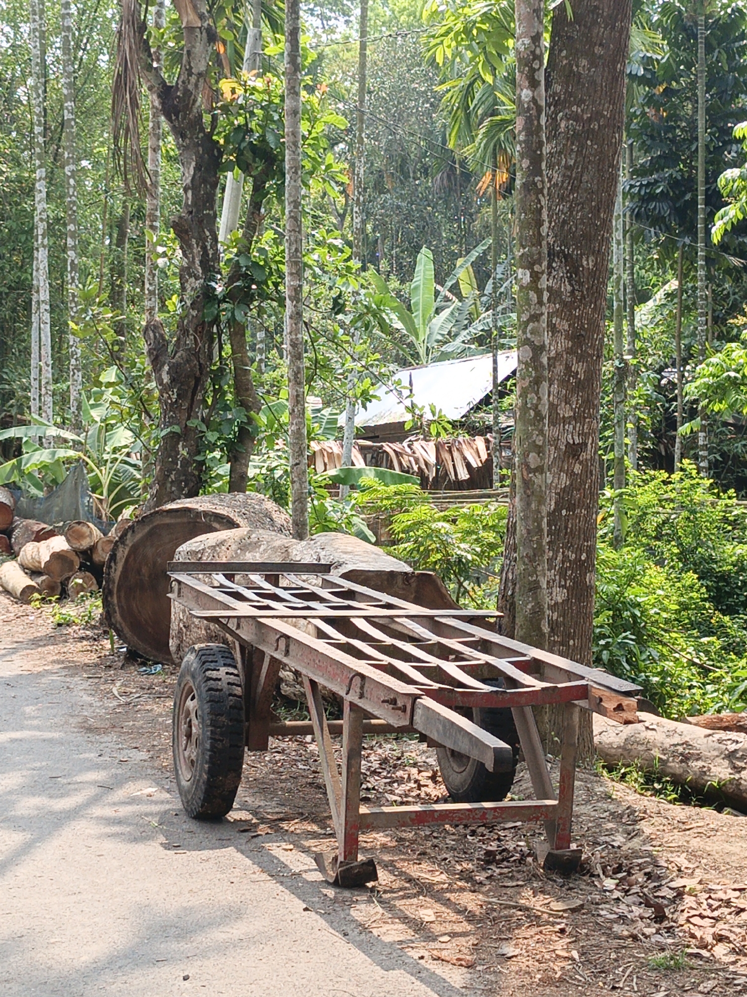 A medium shot depicts a rudimentary wooden and metal cart laden with a large tree trunk, positioned on a paved road in Unknown, Bangladesh. The cart, likely used for transporting heavy materials, is red with two tires and several cross-braces. The large tree trunk it carries dominates the visual space, overshadowing several cut logs to the left. The surrounding environment is densely vegetated with lush trees, palms, and foliage. A corrugated metal roofed structure is visible in the background. The lighting suggests a sunny day, casting shadows that accentuate the textures of the objects and landscape. The scene evokes a rural, tropical setting, likely on the outskirts of a town.