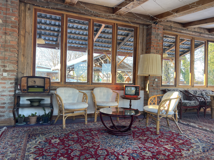 This image depicts a rustic, sunlit interior space, identified as a lounge or sunroom, located in Argveta, Georgia