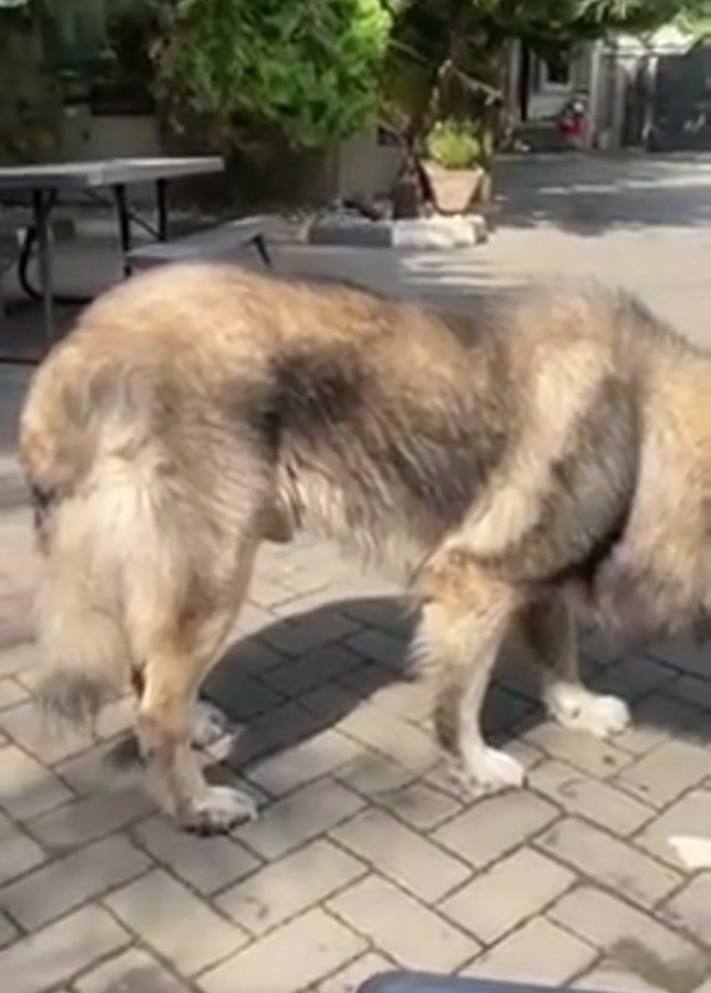 large, long-haired dog in an outdoor setting, possibly a driveway or patio, with light-colored brick pavers