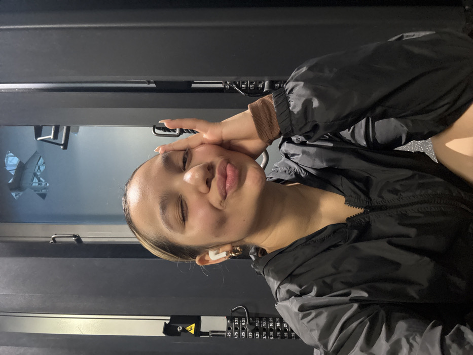 The image displays a close-up, waist-up portrait of a single individual, identified as a female with medium skin tone and dark hair. She is positioned centrally, directly facing the camera. Her right eye is closed in a wink, and her lips are pursed. Her left hand is raised, with the palm resting against her left cheek and her fingers extended upwards. Her fingernails are painted a dark color. She is wearing a black, hooded, zippered jacket. A brown ribbed cuff is visible on her left wrist, extending from beneath the jacket sleeve. A white wireless earbud is inserted into her left ear, positioned above a small, gold-colored hoop earring. The background consists of dark grey or black gym equipment. To the left, a weight stack mechanism is partially visible, displaying incremental weight markings such as ".25", "5", "7.5", "10", "12.5", "15", "17.5", and "20". A yellow triangular warning symbol is also partially discernible on this equipment. In the upper background, a reflective surface, likely a window or glass panel, shows a blurred reflection or view of interior architectural elements, including angular, possibly metallic or glass structures, indicative of a modern building interior. The specific location within the city of Dresden, Germany, cannot be identified from the visual evidence provided in the image.