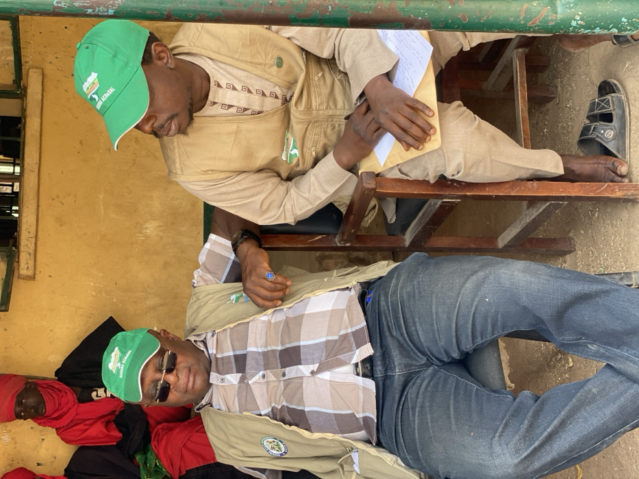 This image depicts two adult males, one older and one younger, seated outdoors or in a semi-open structure in Kawo, Nigeria. The background features a worn, yellow-ochre painted wall with a visible window opening in the upper left. The ground consists of dry, light-colored earth. A green-painted metal pillar is visible on the far right. The older male, positioned on the left, has dark skin and wears dark sunglasses, a green baseball cap with white text (partially visible as "KADUNA CENTRAL"), a brown and white plaid short-sleeved button-up shirt, a light tan multi-pocket utility vest adorned with a circular patch on the left chest, and dark blue jeans. A dark-colored bracelet or watch is on his left wrist, and a ring with a prominent blue stone is on his left ring finger. He is seated on a black office-style chair with his left arm resting on its back. The younger male, seated on a wooden chair to the right of the older male, also has dark skin and a beard. He wears an identical green baseball cap, a light tan long-sleeved tunic featuring brown patterned embroidery around the collar, and an identical light tan utility vest with a circular patch. He is dressed in light tan trousers and black open-toed sandals on his bare feet. His hands are clasped over a light brown envelope and white papers resting on his lap. He is oriented towards the older male. Two additional individuals are partially visible in the left background. One person, positioned behind the older male, wears a red head covering that obscures most of their face and a red garment. Another individual in dark clothing is partially visible further to the left. The scene is illuminated by natural daylight.