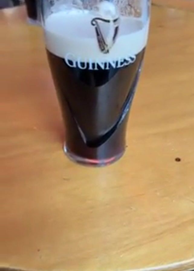 glass of Guinness stout on a light brown wooden table, with a Guinness logo on the glass. The stout has a dark body and a creamy white head. The camera zooms in slightly on the glass. A person wearing black pants is visible in the lower portion of the frame. Additional glasses of Guinness are visible in the background. The floor appears to be dark gray tile.