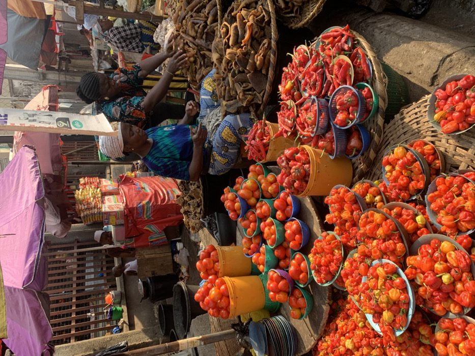This image captures a vibrant, active outdoor market scene in Lagos, Nigeria
