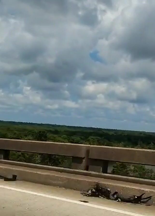 A view from inside a car driving on a highway bridge. The bridge has a concrete barrier on the right side. The view from the car window shows a dense, green forest stretching to the horizon under a sky filled with fluffy white clouds and patches of blue. A white semi-truck passes on the left. The camera angle is slightly high, offering a wide perspective of the landscape. The car's side mirror is visible in the lower left corner of the frame.