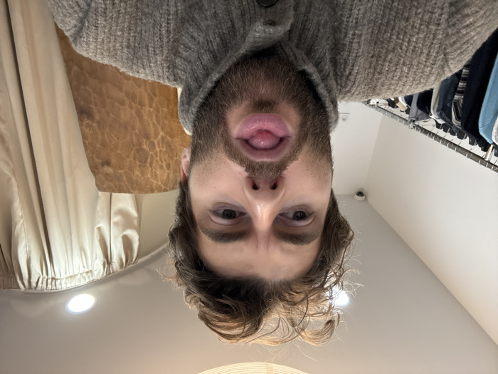An upside-down selfie features a bearded man wearing a gray cardigan, sticking his tongue out