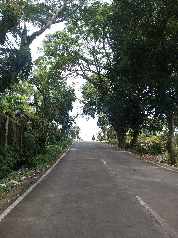 A narrow paved road stretches uphill, flanked by lush trees forming a leafy canopy overhead
