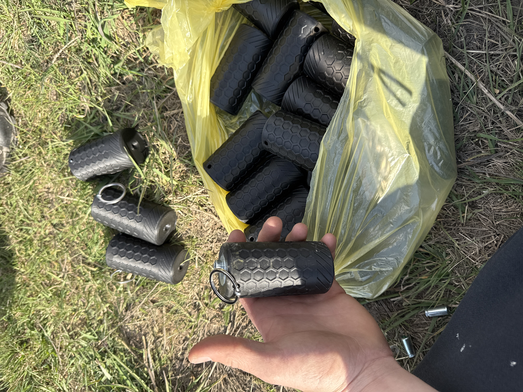 A close-up, high-angle outdoor scene depicts a grassy area under direct sunlight. A light-skinned human hand, positioned in the lower-left quadrant, holds a single black, cylindrical object approximately 10-12 cm in length and 5-6 cm in diameter. The object features a raised hexagonal pattern across its main body and has a silver-colored split ring attached to one end via a metallic bolt. This item strongly resembles an inert training grenade or a similar non-explosive device. To the right of the hand, a translucent yellow plastic bag lies on the grass, containing a substantial quantity of identical black cylindrical objects. Several other individual black cylindrical objects are scattered on the grass outside the bag, particularly in the upper-central and upper-right areas of the frame. On the grass near the bottom-left of the frame, adjacent to the visible hand and a dark fabric surface (likely clothing), two silver-colored, spent casings are visible. The ground consists of patchy, dry green and brown grass with areas of exposed soil and dead vegetation. Shadows are prominent, indicating bright daylight. No specific architectural landmarks or unique environmental features are present to determine a precise location within the city of Sofia, Bulgaria; the scene appears to be an open, uncultivated, or park-like grassy area.