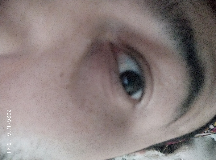 The image presents a tight close-up of a human left eye, positioned slightly left of the frame's vertical center, against a highly blurred and indistinct background. The eye exhibits a dark iris and a clearly visible pupil. The upper eyelid shows a slight crease. A prominent, dark eyebrow arches above the eye. The surrounding skin appears to be light to medium in tone, with a subtle reddish discoloration visible directly beneath the lower eyelid and extending onto the upper cheek area. A patterned fabric, multicolored and out of focus, is partially visible on the top right side of the image, likely part of a head covering or garment. The scene is located in the city of Khiva, Uzbekistan. A digital timestamp "2026/1/16 15:41" is present in the bottom right corner.