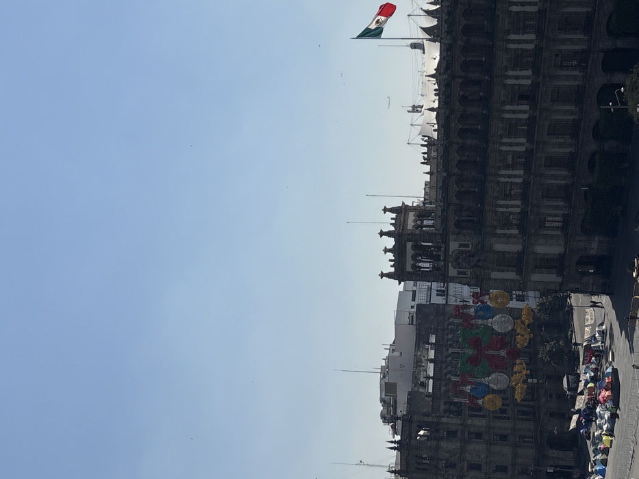 cityscape featuring a large building complex with ornate architecture. A Mexican flag waves atop one of the buildings. Colorful decorations adorn the lower sections of the buildings, adding a festive touch. The sky is clear and blue. People and tents are visible in the plaza below. The photo appears to have been taken from a high vantage point.