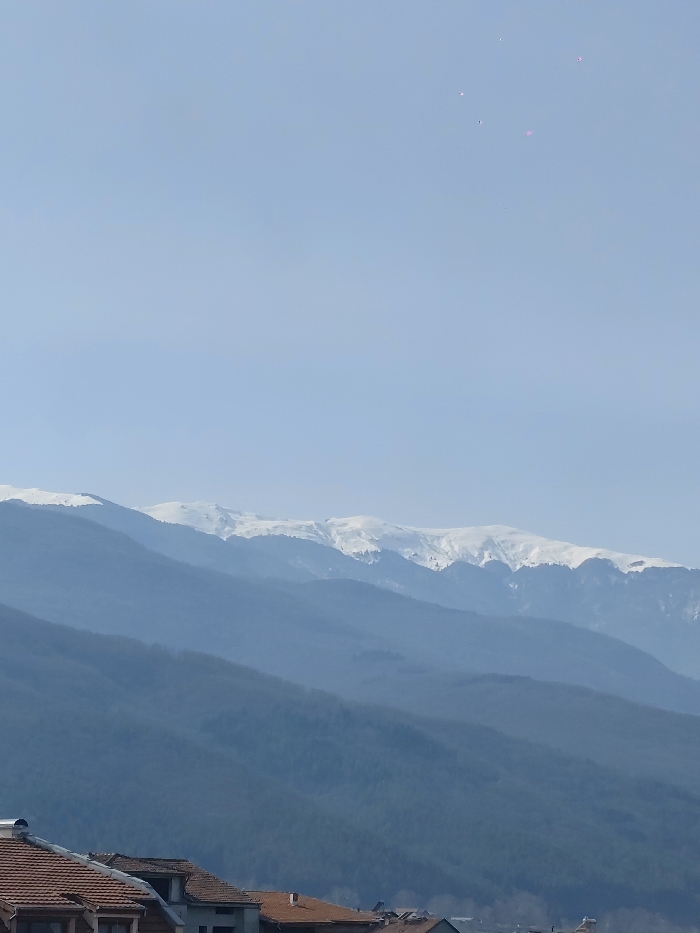 An outdoor, wide-angle shot depicts a panoramic view of mountainous terrain and urban rooftops under a clear, light blue sky, indicating the city of Petrich, Bulgaria. The upper third of the frame is dominated by the unobstructed sky, which exhibits several faint, small, pinkish-purple circular artifacts clustered in the upper-central area. The middle ground features a distinct range of snow-capped mountains, appearing bright white against the sky, with visible dark rock and tree lines beneath the snow. Below this, multiple layers of forested mountain slopes, progressively darker and more muted in tone towards the foreground due to atmospheric perspective, recede into the distance. In the lower portion of the image, the reddish-brown tiled roofs of several buildings are visible, partially obscured by the foreground mountains. These structures display light-colored facades and are consistent with residential or commercial architecture. No individuals, animals, or active objects are present in the scene.