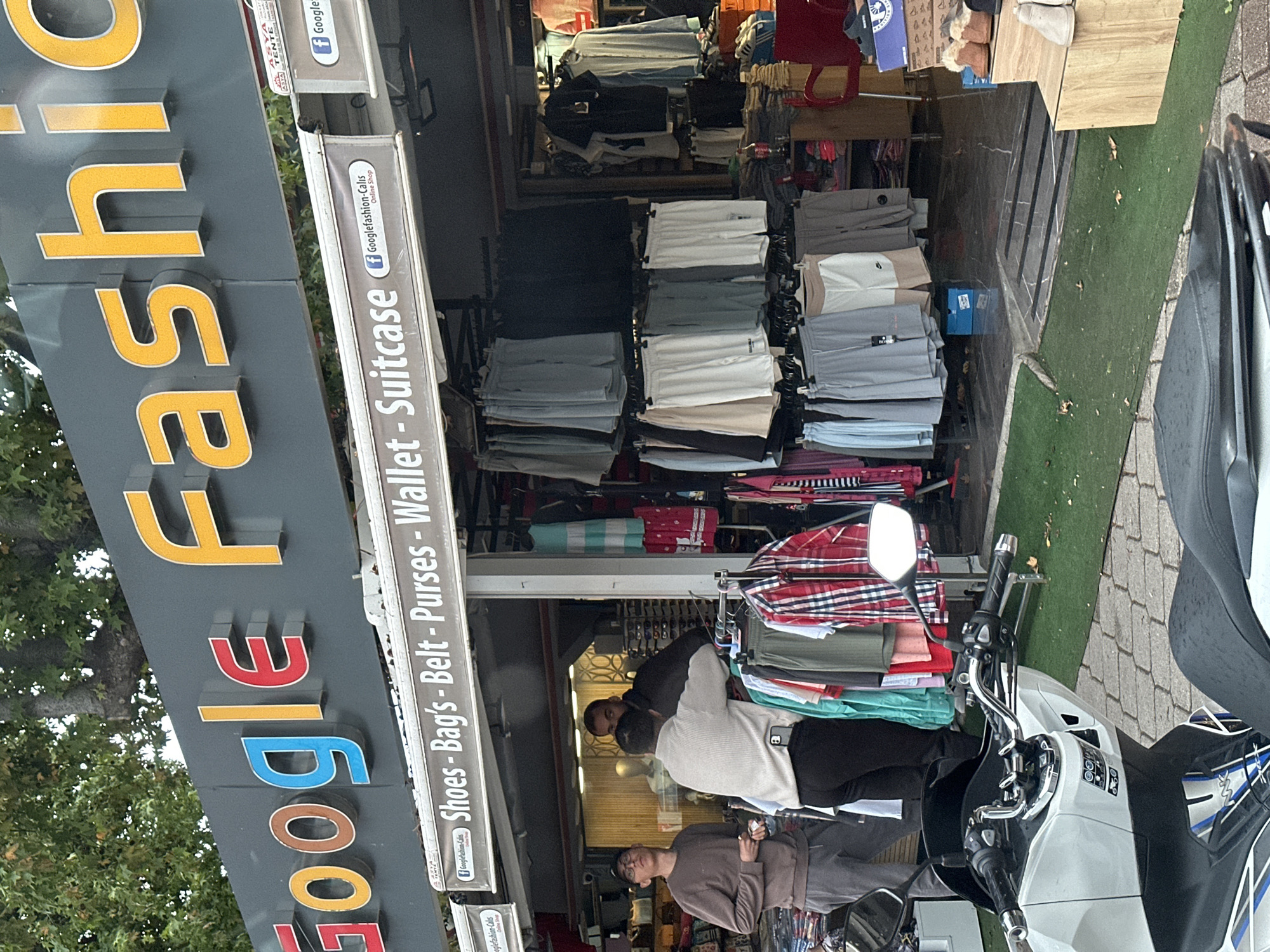 The image captures an outdoor clothing store named "Google Fashion" in Fethiye, Turkey. The store sells a variety of items including shoes, bags, belts, purses, wallets, and suitcases. Shoppers can be seen browsing the clothes racks. A scooter is parked near the storefront, partially obstructing the view. The environment includes street-level details, such as the sidewalk and some greenery.