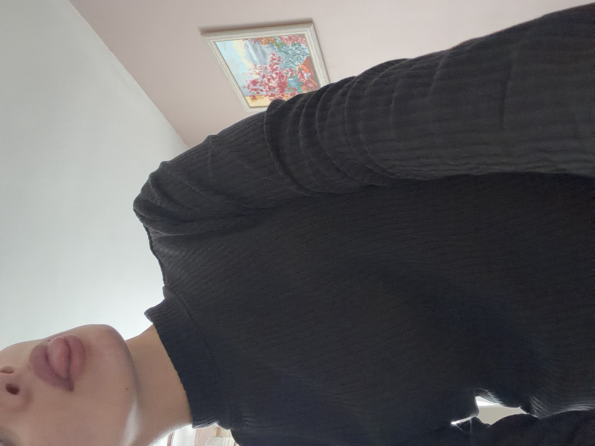 person wearing a black ribbed turtleneck shirt. The person's face is visible in the lower left corner of the frame, with their tongue sticking out. In the background, there is a painting on the wall, and part of the ceiling is visible. The location appears to be indoors. There is no indication from the image that the location is Rudartsi, Bulgaria.