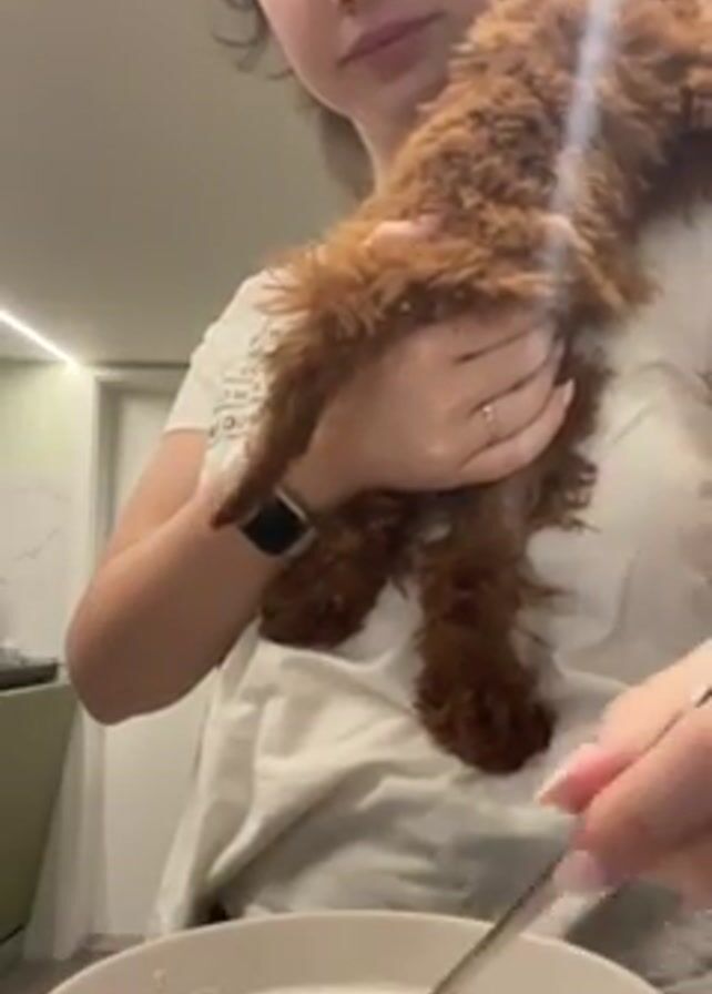 In a kitchen, a young woman stands holding a small, brown, curly-haired dog in her arms
