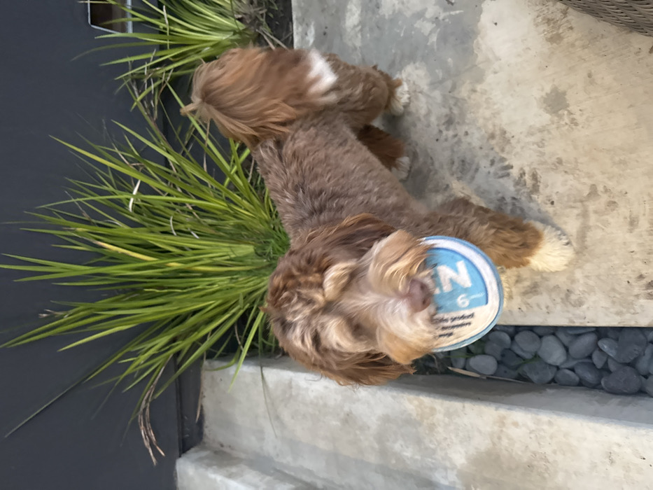 The image depicts a medium-sized dog in an outdoor residential setting. The dog has curly, multi-toned brown and tan fur, with white paws and a white patch near the base of its tail. Its tail appears to be in motion. The dog stands on a light grey concrete or tiled surface, holding a circular blue and white toy, possibly a soft frisbee, in its mouth. The toy features the letter "N" and partial text, including "graded." To the left of the dog, a narrow strip of dark grey river rocks is visible, bordered by a concrete edge. The background features a dark grey wall or fence, in front of which are several clusters of tall, green, blade-like plants. The environment is consistent with a private garden or patio in Los Angeles, United States.