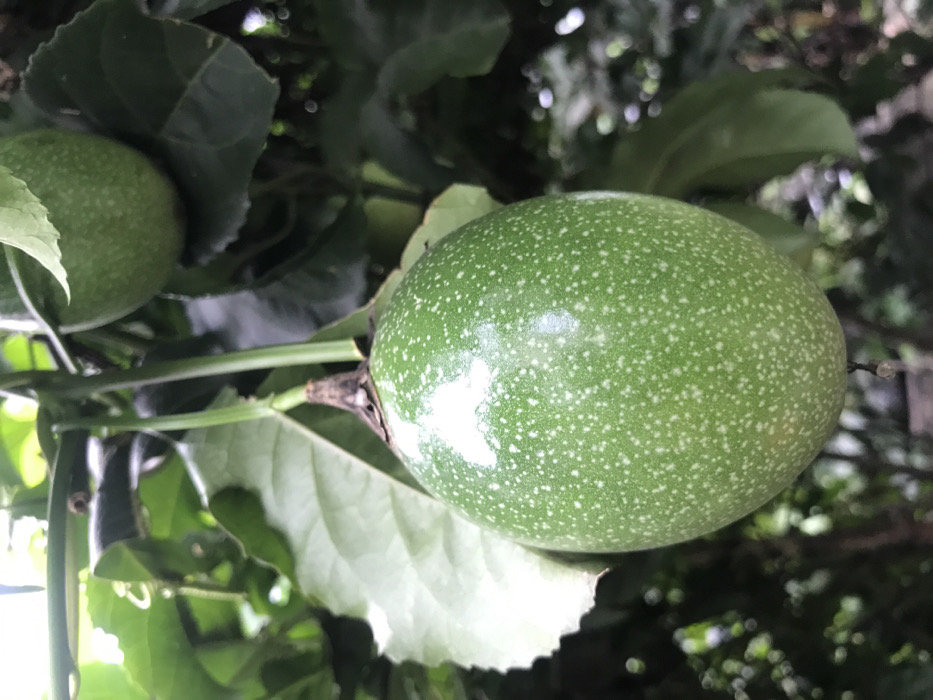 - "A close-up photograph displays a vibrant green, unripe ovoid passion fruit (Passiflora edulis) hanging centrally from its vine" by FM-UNuwJ3, licensed under CC BY 4.0