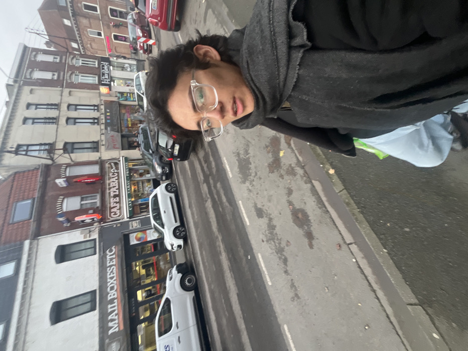 - "An individual with dark, wavy hair and clear-framed glasses is depicted in a close-up, looking directly at the camera from a wet sidewalk in Villeneuve-d'Ascq, France" by FM-NQrs03, licensed under CC BY 4.0