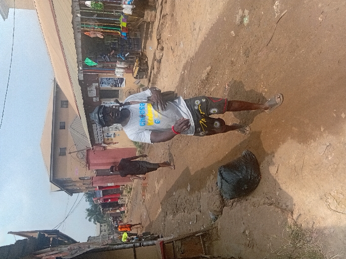 This image depicts a daytime scene on an unpaved, reddish-brown dirt road in Awka, Nigeria. The sky is hazy and light blue. In the immediate foreground, centered to the right, an adult dark-skinned male walks towards the camera. He wears a white short-sleeved t-shirt with a blue and yellow graphic resembling a flag and the text "Choose." His lower attire consists of dark shorts with yellow and white patterns. He wears light-colored slide sandals. On his head is a dark, possibly leather, cap with a short brim, and he wears dark-rimmed glasses. A dark strap from a shoulder bag crosses his torso, and he carries a long, dark object, possibly a stick or staff, resting on his right shoulder. To the left of the foreground subject, on the dirt road near a shallow ditch, lies a black plastic trash bag. Further down the road, to the left of the central path, a second adult dark-skinned male walks away from the camera, barefoot, wearing a dark t-shirt and dark shorts. On the far left, partially obscured by a structure, two additional figures are visible, one wearing a bright yellow or orange top, appearing to be near or on a bicycle. The road is bordered by buildings on both sides. On the right, a long, single-story building with a corrugated metal roof houses multiple shops or stalls. Various household items, including brooms, mops, plastic wares, and what appears to be a small generator, are displayed outside. Further back, a multi-story building with a light brown roof and a perimeter wall topped with barbed wire is visible. On the left side of the road, structures with corrugated metal roofs and signs suggest commercial activity. Overhead, electrical or utility lines stretch across the sky. The overall environment suggests an urban or semi-urban street, likely a marketplace or residential area with commercial outlets.