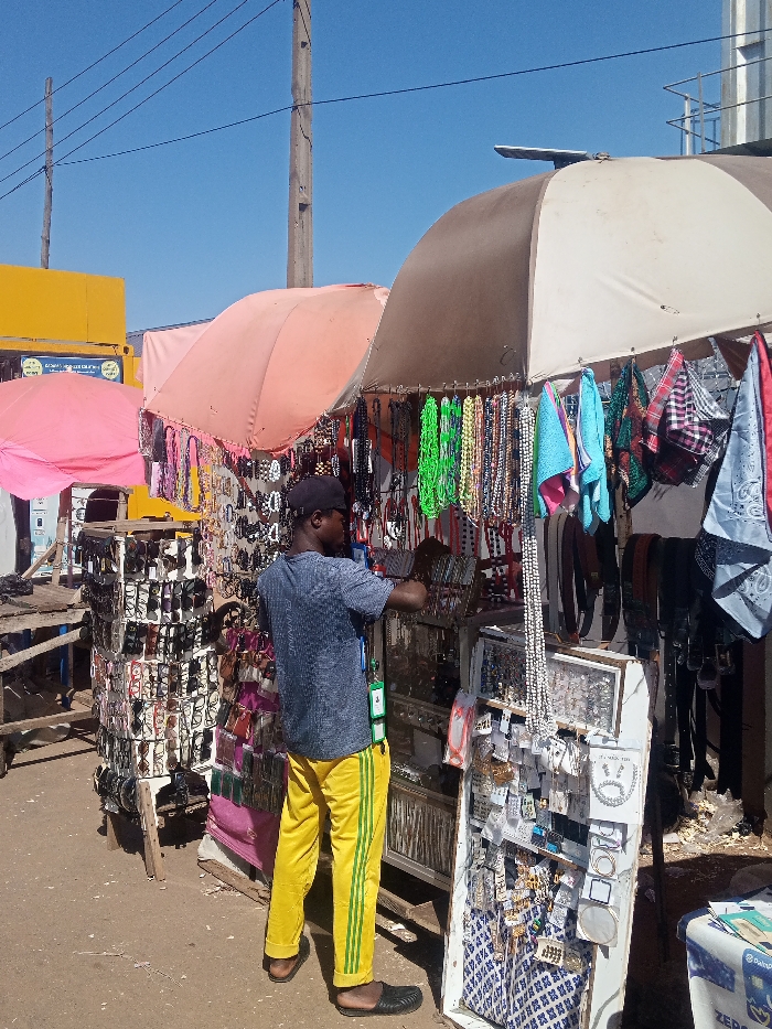 An outdoor market scene in Hayin Banki, Nigeria, features a male vendor attending to a stall under a two-toned brown and beige domed umbrella