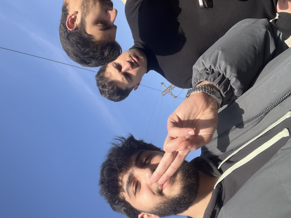 The image depicts three males outdoors under a clear blue sky in At-Tall, Syria