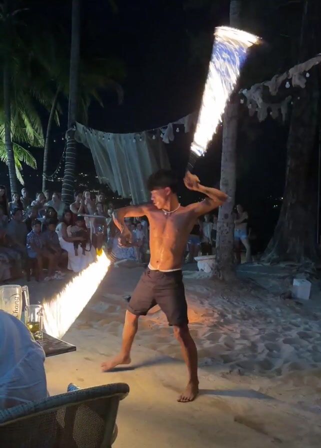 shirtless man performing a fire show on a beach at night. The man is holding two flaming batons and expertly twirling and swinging them around his body. A crowd of people is seated on benches and chairs, watching the performance. Behind the crowd are palm trees and a fabric-draped structure decorated with lights. The ground is sandy, illuminated by the fire and some artificial lights. A person is seated at a table in the foreground, partially obscuring the view with their back and a drink on the table.